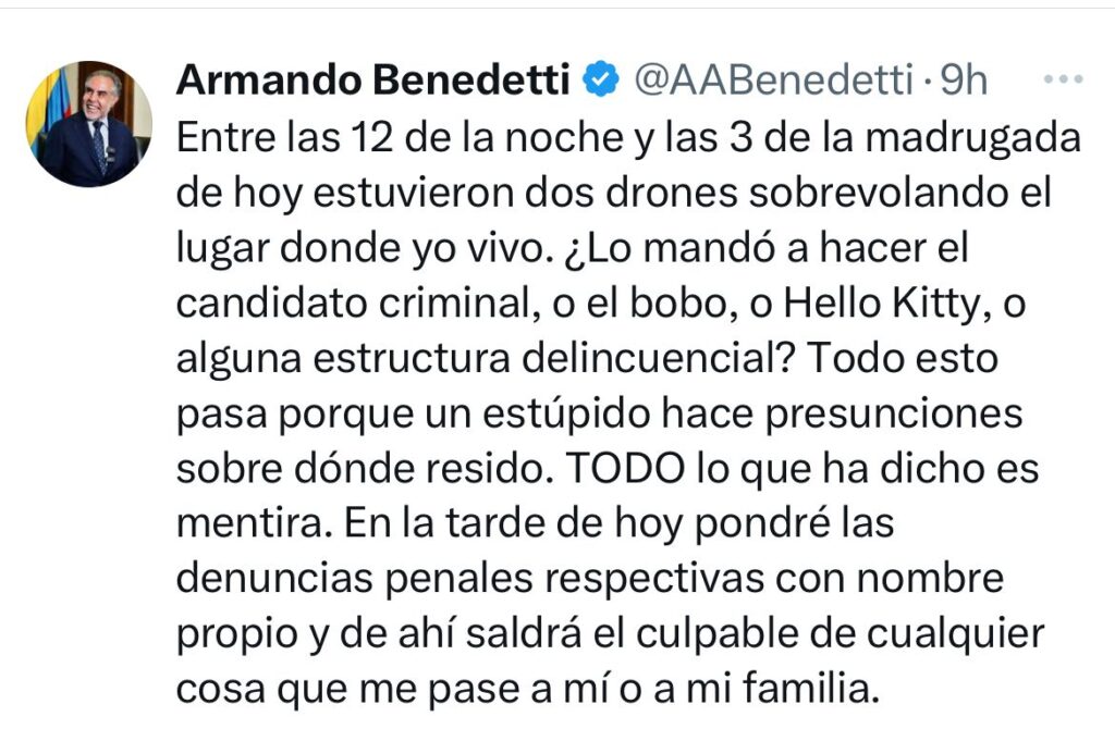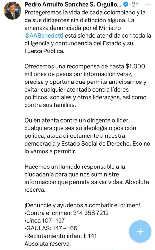 Más tarde en X, respondió el MinDefensa, Pedro Sánchez, «Protegeremos la vida de cada colombiano y la de sus dirigentes sin distinción alguna (…) La amenaza denunciada por el ministro Armando Benedetti está siendo atendida con toda la diligencia y contundencia del Estado y su Fuerza Pública»