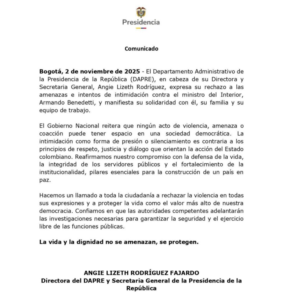 También la directora del DAPRE y Secretaria General de la Presidencia de la República, Angie Lizeth Rodriguez Fajardo, rechaza toda forma de amenaza e intimidación en contra el MinInterior, Armando Benedetti.