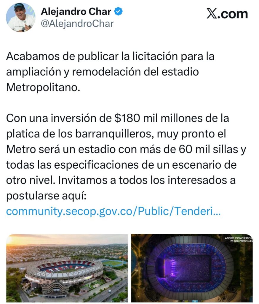 El alcalde de Barranquilla Alejandro Char publicó en sus redes sociales la licitación para la ampliación y remodelación del estadio Metropolitano de Barranquilla.
