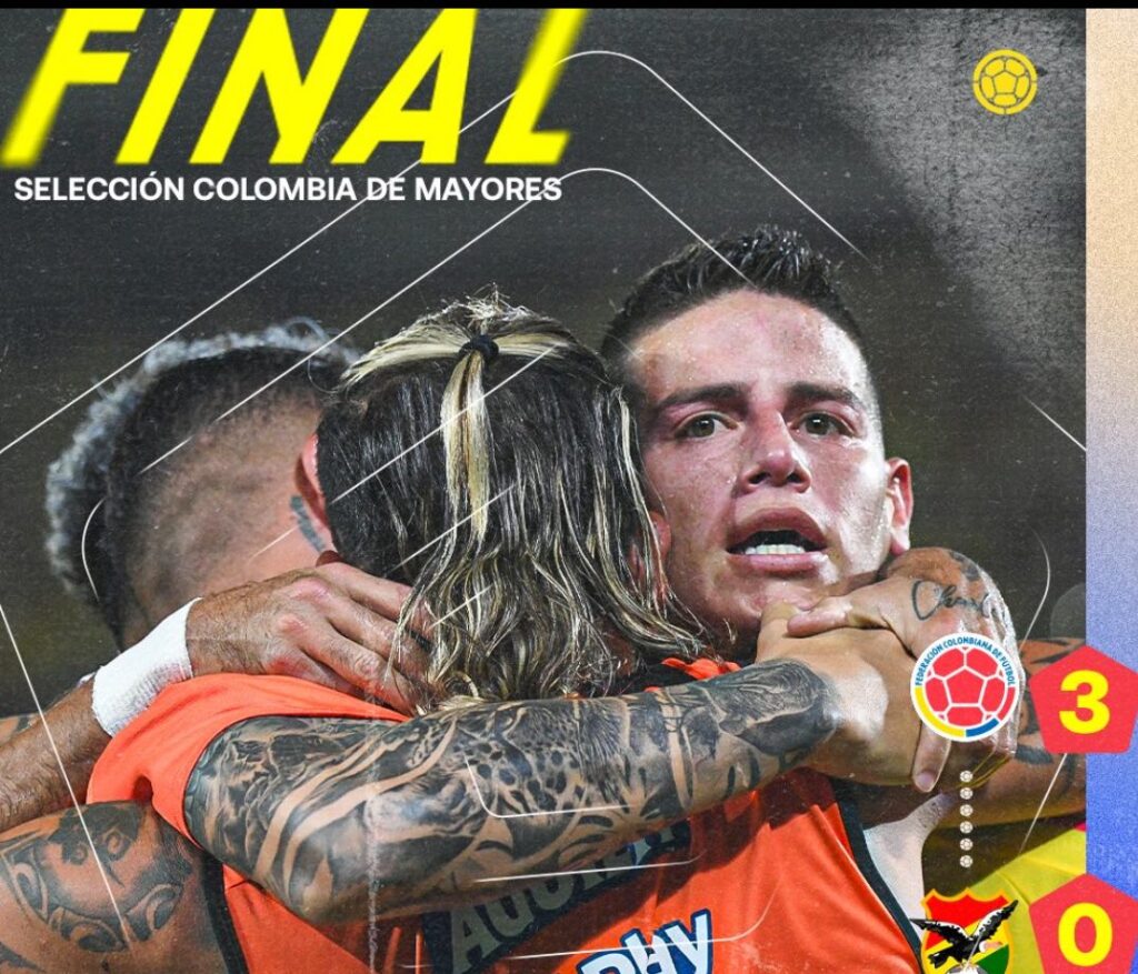 Con goles de James Rodriguez, JuanFer Quintero y Jhon Córdoba, Colombia derrotó en el estadio Metropolitano de Barranquilla a la Selección de Bolivia 3 goles a 0. Con esta victoria Colombia ya está en el Mundial de Estados Unidos, Canadá y México 2026.