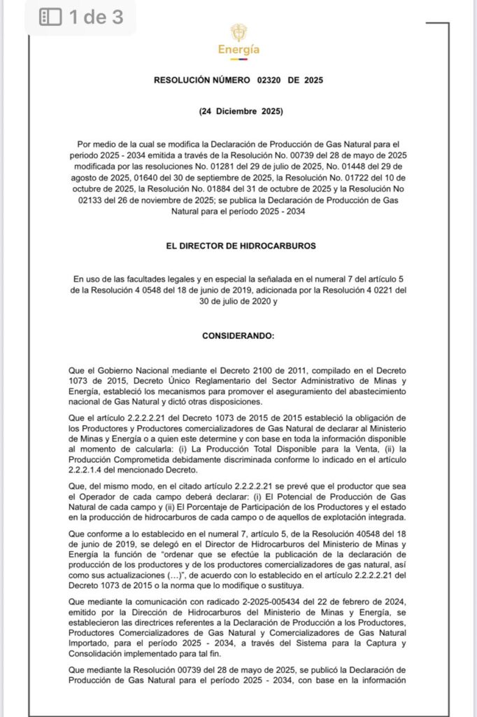 La información consolidada de la Declaración de Producción de Gas Natural 2025–2034 se encuentra disponible para consulta pública en el Portal del Ministerio de Minas y Energía