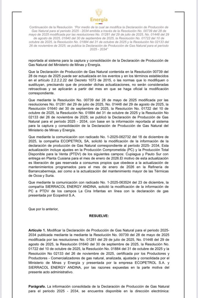 El jefe de la cartera minera y energética reiteró que las modificaciones no son retroactivas y se aplican a partir del mes en que se hacen oficiales, conforme a la normatividad vigente.“La seguridad energética es una prioridad del Gobierno nacional. Por eso actuamos con rigor técnico, defendiendo el interés público y asegurando que el gas natural llegue de manera oportuna y a precios justos a todos los colombianos”, agregó Palma.