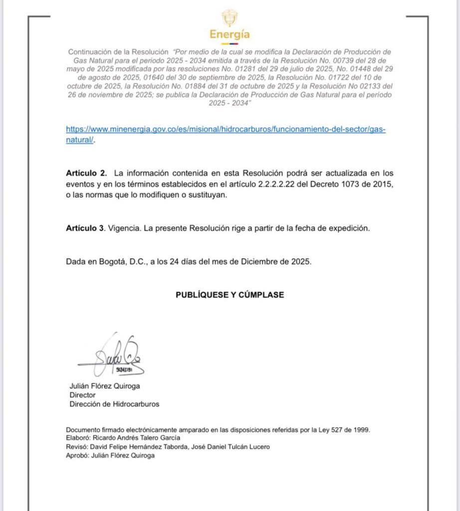 El ministro de Minas y Energía, Edwin Palma, aseguró que la medida fortalece la planeación y la transparencia del sector. “Esta actualización demuestra que el país cuenta con información clara y confiable sobre su producción de gas natural. Nuestro objetivo es garantizar el abastecimiento, frenar la especulación y dar tranquilidad a los hogares, al transporte y a la industria”, dijo.