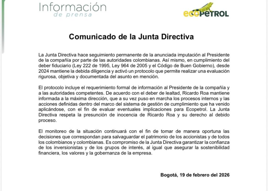 En el comunicado se informa que la junta Directiva hace seguimiento permanente de la anunciada imputación al Presidente de Ecopetrol por parte de las autoridades colombianas en cumplimiento del deber fiduciario Ley 222 de 1995, Ley 964 de 2005 y el Código de Buen Gobierno.