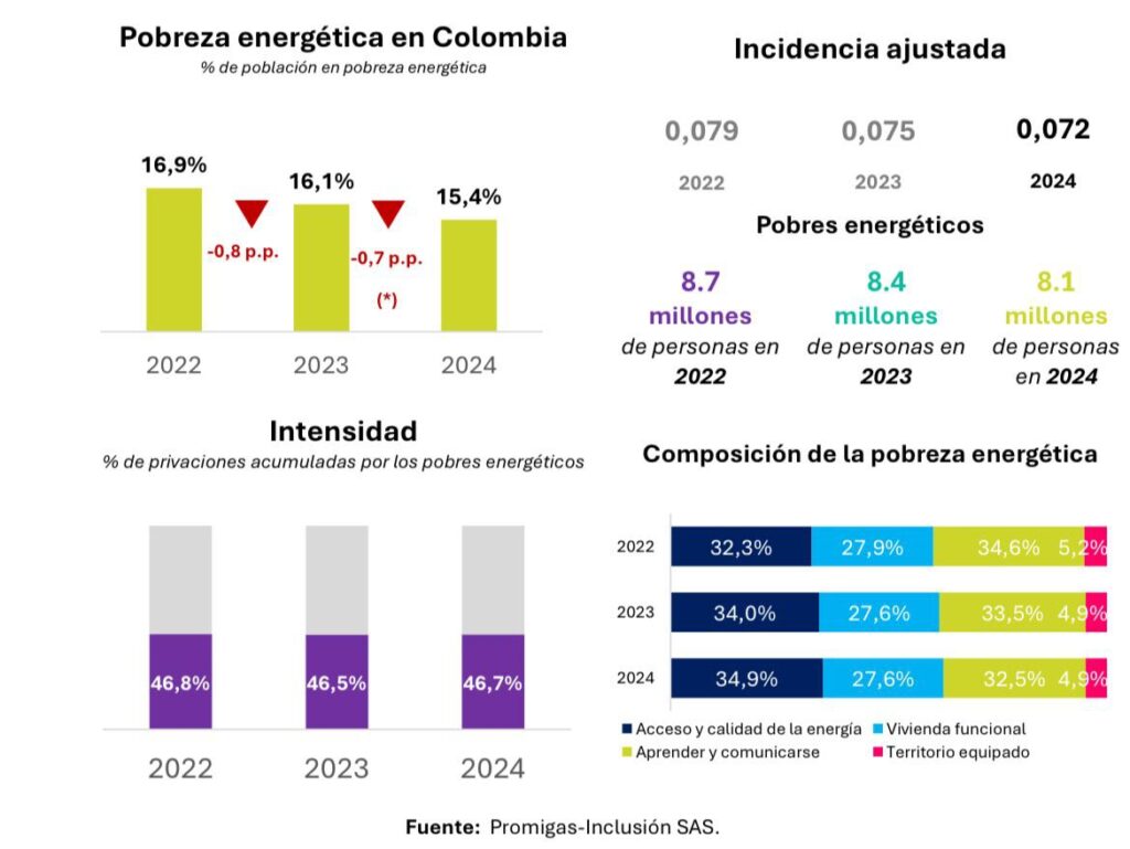 En 2023, la pobreza energética en Colombia alcanzaba el 16,1%, equivalente a 8.4 millones de personas. Durante 2024, esta cifra bajó a 15,4%, reflejando que más de 300 mil colombianos superaron esta situación. Pese a este avance, aún hay cerca de 8.1 millones de personas en condición de pobreza energética.