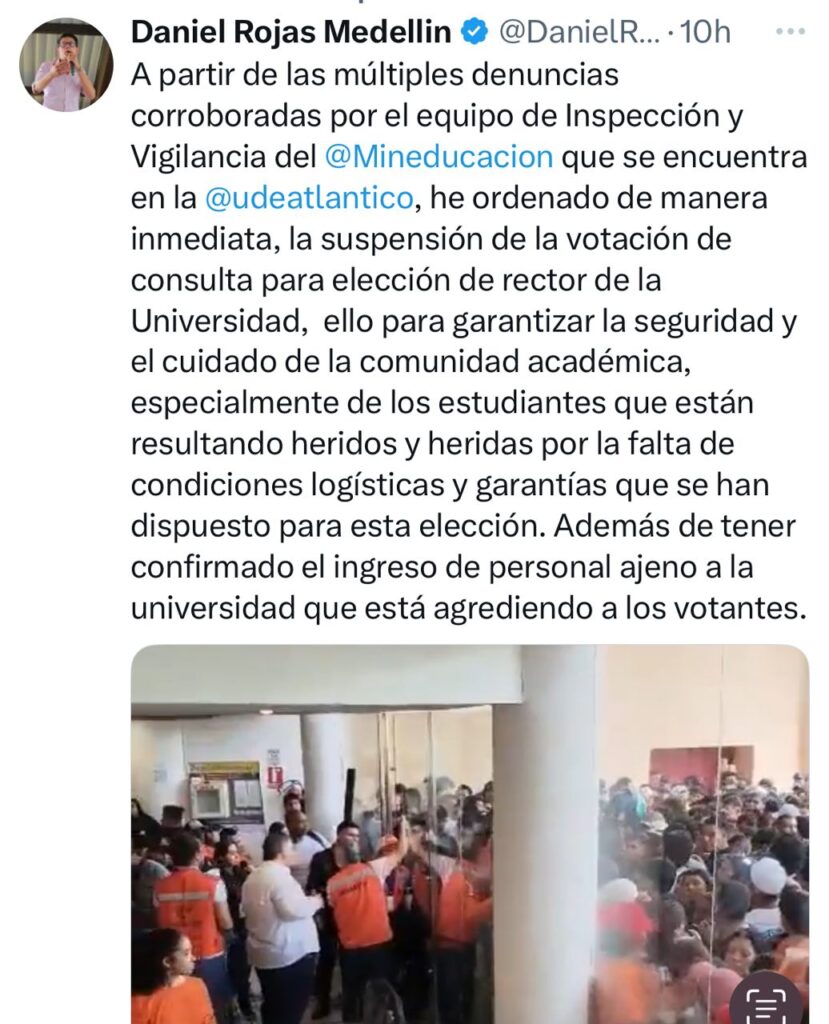 EL CONSEJO SUPERIOR DE LA UNIVERSIDAD DEL ATLÁNTICO ADUCE AUTONOMÍA ADMINISTRATIVA Y POR ESO SIGUIÓ LA ELECCIÓN DE RECTOR MIENTRAS QUE EL MIN EDUCACIÓN DANIEL ROJAS HABÍA ORDENADO SUSPENDER LOS COMICIOS POR LOS DISTURBIOS EN LA MAÑANA DEL 2 DE OCTUBRE.