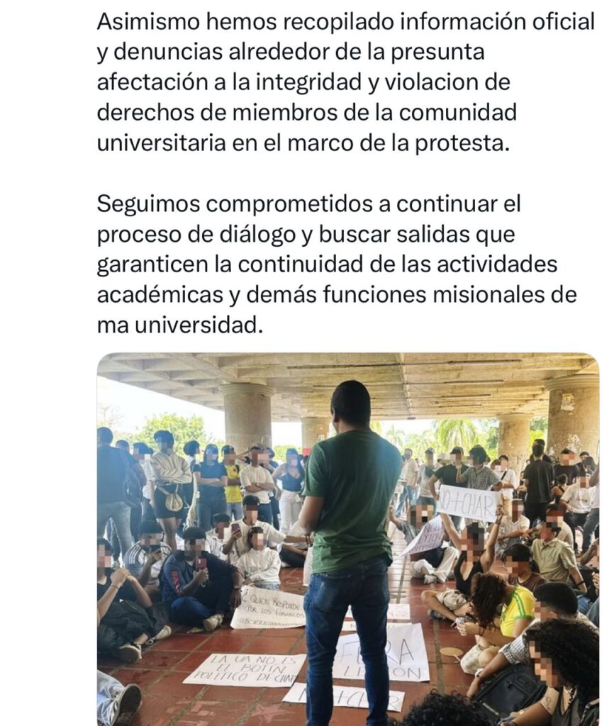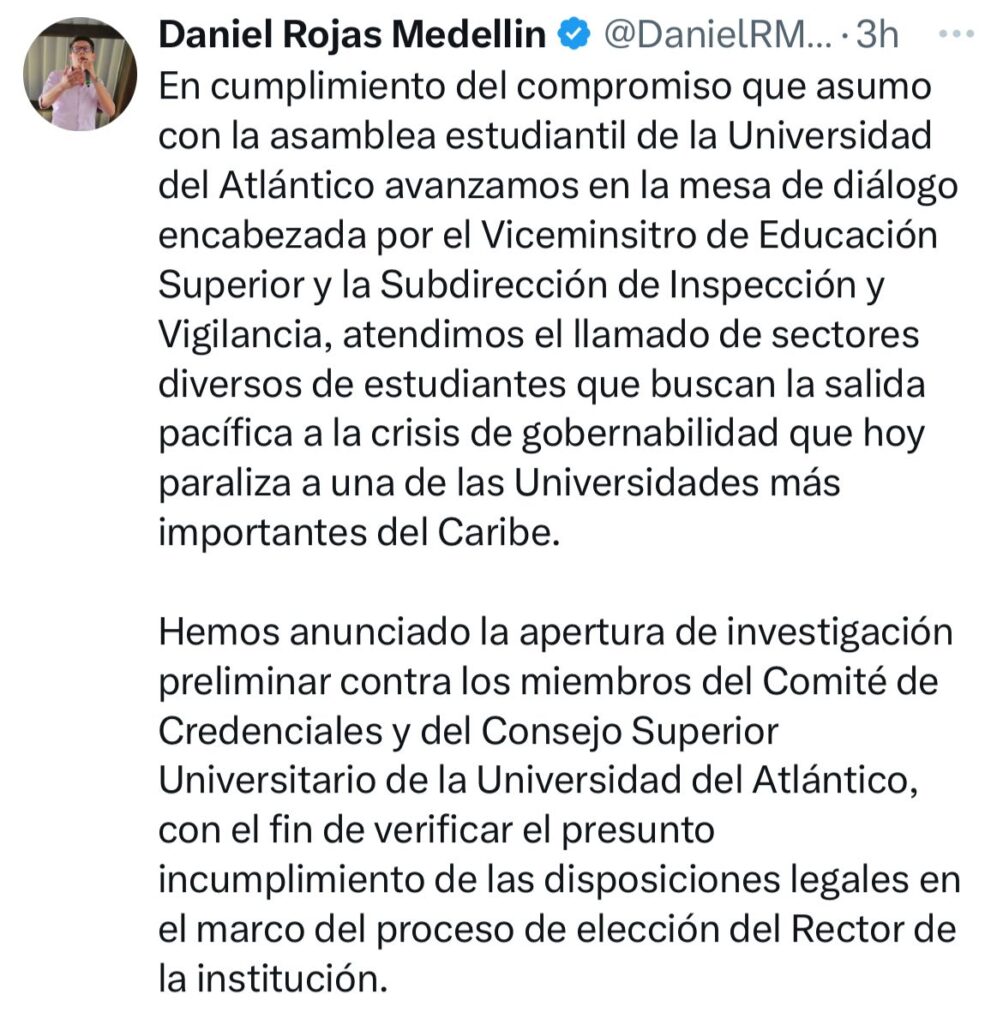 En su cuenta de X , escribió Daniel Rojas, Ministro de Educación » Atendemos el llamado de sectores diversos de estudiantes que buscan la salida pacífica a la crisis de gobernabilidad que hoy paraliza a una de las universidades más importantes del Caribe. Hemos anunciado la apertura de una investigación preliminar contra miembros del Comité de Credenciales y del Consejo Superior Universitario de la Universidad del Atlántico , con el fín de verficar el presunto incumplimiento de las disposiciones legales en el marco del proceso de elección del rector de la Institucción. Asi mismo, hemos recopilado información oficial y denuncias alrededor de la presunta afectación a la integridad y violación de derechos de miembros de la comunidad universitaria en el marco de la protesta»