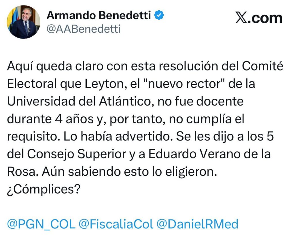 En X MinINterior muestra una resolución del Comité Electoral donde se confirma que Leyton, el «nuevo rector» de la Universidad del Atlántico, no fue docente durante 4 años y por tanto no cumplía el requisito. Lo había advertido. Se les dijo a los 5 del Consejo Superior y a Eduardo Verano de la Rosa. Aún sabiendo esto lo eligieron. ¿Cómplices?