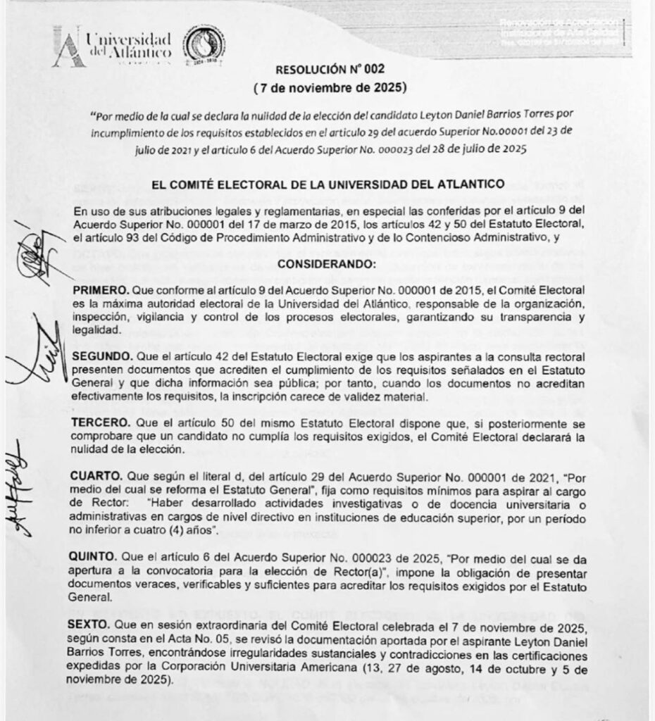 Resolución del Comité Electoral de la Universidad del Atlántico señala que Leyton Barrios, no fue docente durante cuatro años y por tanto no cumple el requisito de "rector"