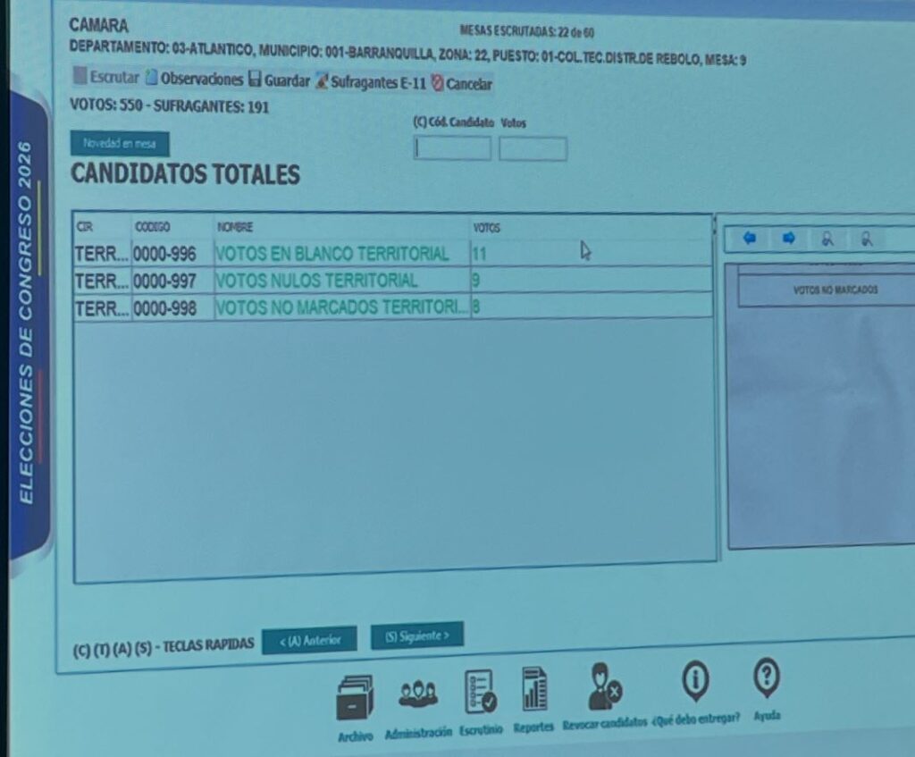 En presencia de numerosos abogados de distintos partidos políticos y representantes del Ministerio Público, registraduría, y los funcionarios encargados de los escrutinios de la zona 44, debieron destruir 359 votos consignados en tarjetones electorales que estaban de más en la mesa 9, zona 22, puesto 1 que funcionó en el colegio Distrital del Barrio Rebolo.