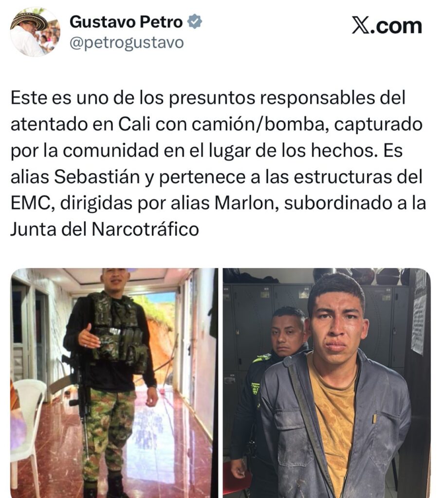 En X el Presidente Gustavo Petro reveló el rostro de uno de los presuntos responsables del atentado en Cali que dejó seis muertos y 70 heridos. El capturado es alias ‘Sebastian’, quién pertenece a las estructuras del Estado Mayor Central y quién rendiría cuentas a alias Marlon, el Presidente lo catalogó como un ‘subordinado a la Junta del Narcortráfico’. El nombre del capturado es Walter Steban Yonda Ipia, de 23 años de edad