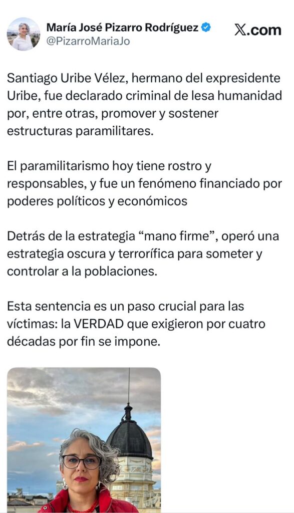 También se expresó el senador y precandidato presidencial del Pacto Histórico» Iván Cepeda, señaló en X «Excelente noticia para las víctimas, la verdad y la justicia en Colombia»