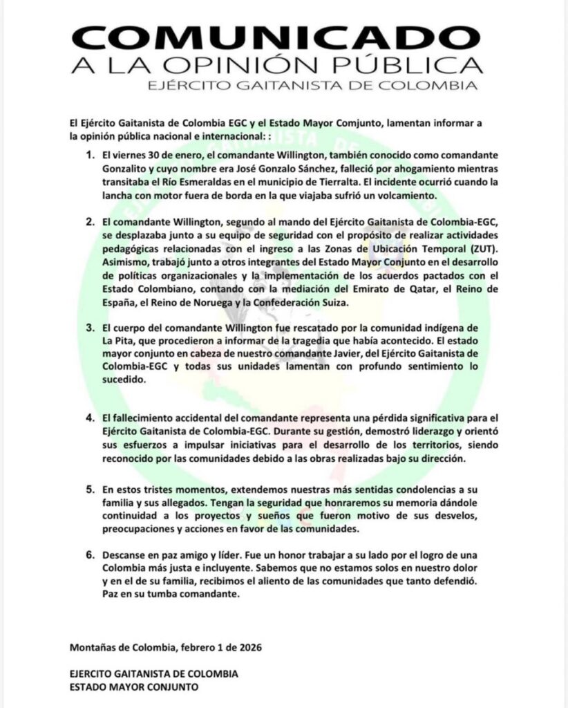 En un comunicado difundido por el Clan del Golfo, informa que ‘Gonzalito’; también conocido como ‘Willintong’, falleció el pasado viernes por ahogamiento mientras transitaba por el río Esmeraldas en el municipio de Tierralta» en la región región Caribe, en norte del país, cuando la lancha con motor fuera de borda sufrió un volcamiento en el río Esmeraldas.