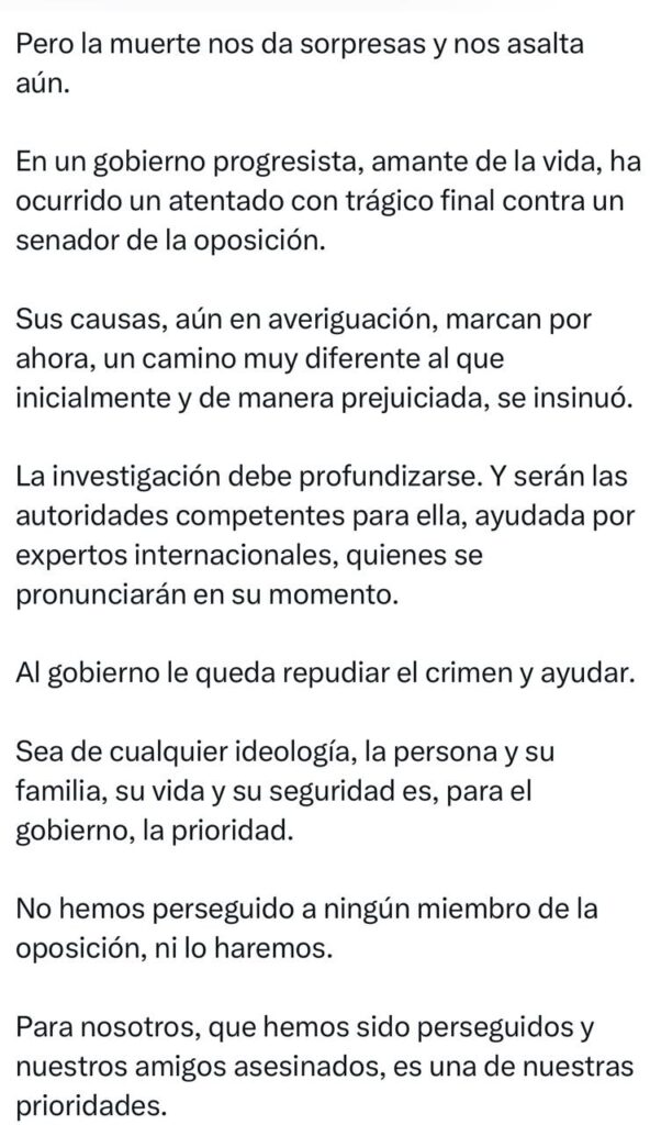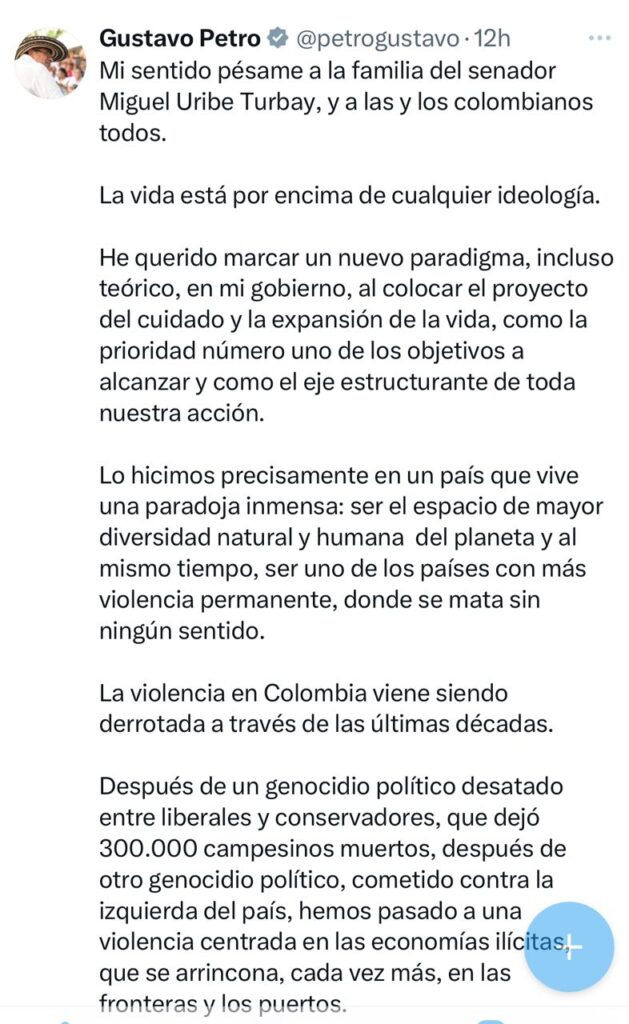 El Presidente de los colombianos Gustavo Petro Urrego, lamentó la muerte del senador y precandidato presidencial Miguel Uribe Turbay, extendió condolencias a la familia y a los colombianos, igualmente solicitó a la Fiscalía General de la Nación, profundizar en la investigación que permita arrojar resultados contundentes sobre el ataque que sufrió el joven dirigente político el pasado 7 de junio, en el parque Golfito, barrio Modelia de la ciudad de Bogotá.