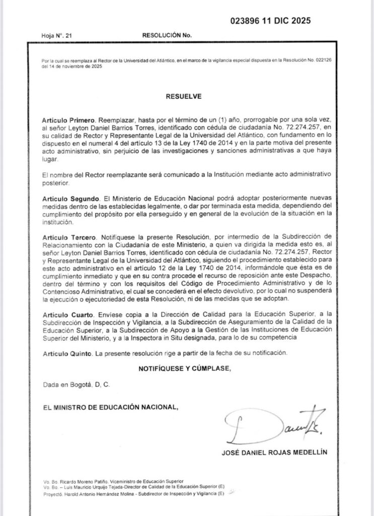 El ministerio de Educación revocó al actual rector de la Universidad del Atlántico Leyton Barrios, y anuncia que se encargará a un rector que estará en el cargo durante un año y a la vez tomarían la decisión de dejar sin piso a los directivos actuales de esa Alma Mater.