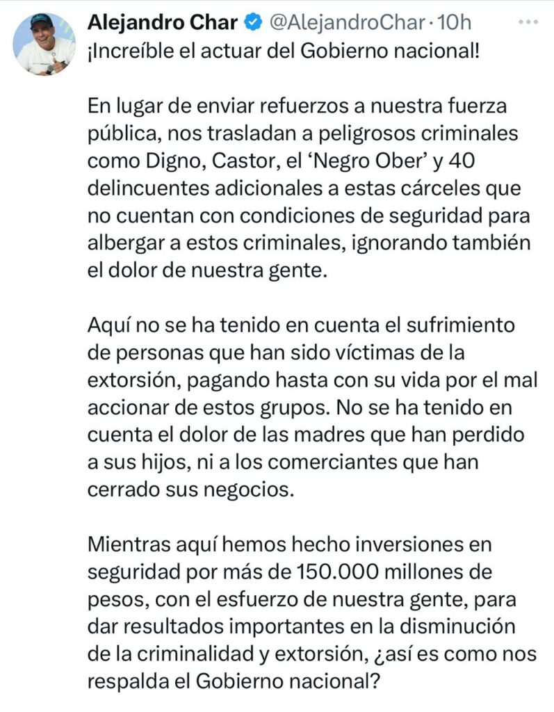Como Increible, calificó el alcalde Alejandro Char, el actuar del Gobierno nacional por pretender envíar a los cabecillas de las organizaciones criminales ‘Digno Palomino’, ‘Castor’, el ‘Negro Ober’, y 40 delincuentes adicionales a las cárceles de Barranquilla que no cuentan con condiciones de seguridad para albergar a estos criminales, ignorando también el dolor de nuestra gente.
