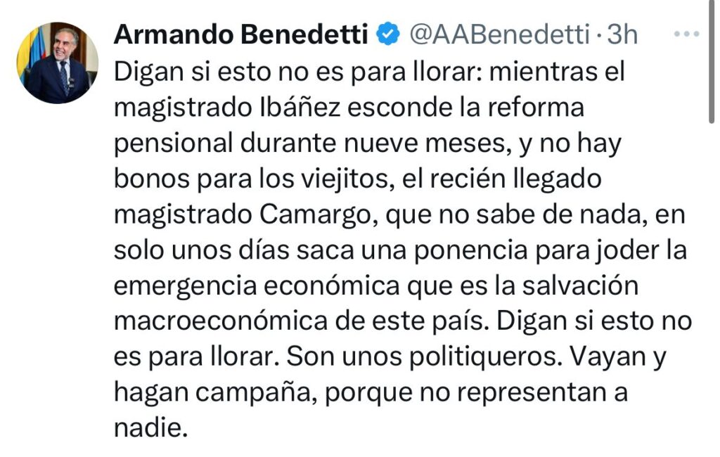 DIGAN SI ESTO NO ES PARA LLORAR: MIENTRAS EL MAGISTRADO IBAÑEZ ESCONDE LA REFORMA PENSIONAL DURANTE NUEVE MESES, NO HAY BONOS PARA LOS VIEJITOS, ESCRIBE EN X, BENEDETTI