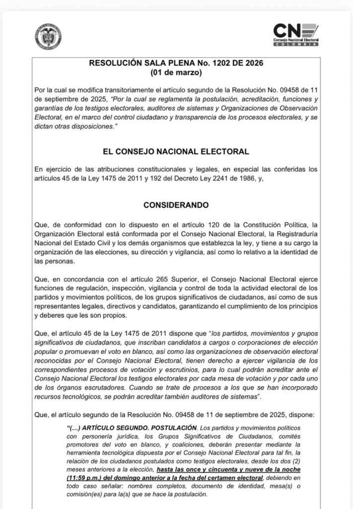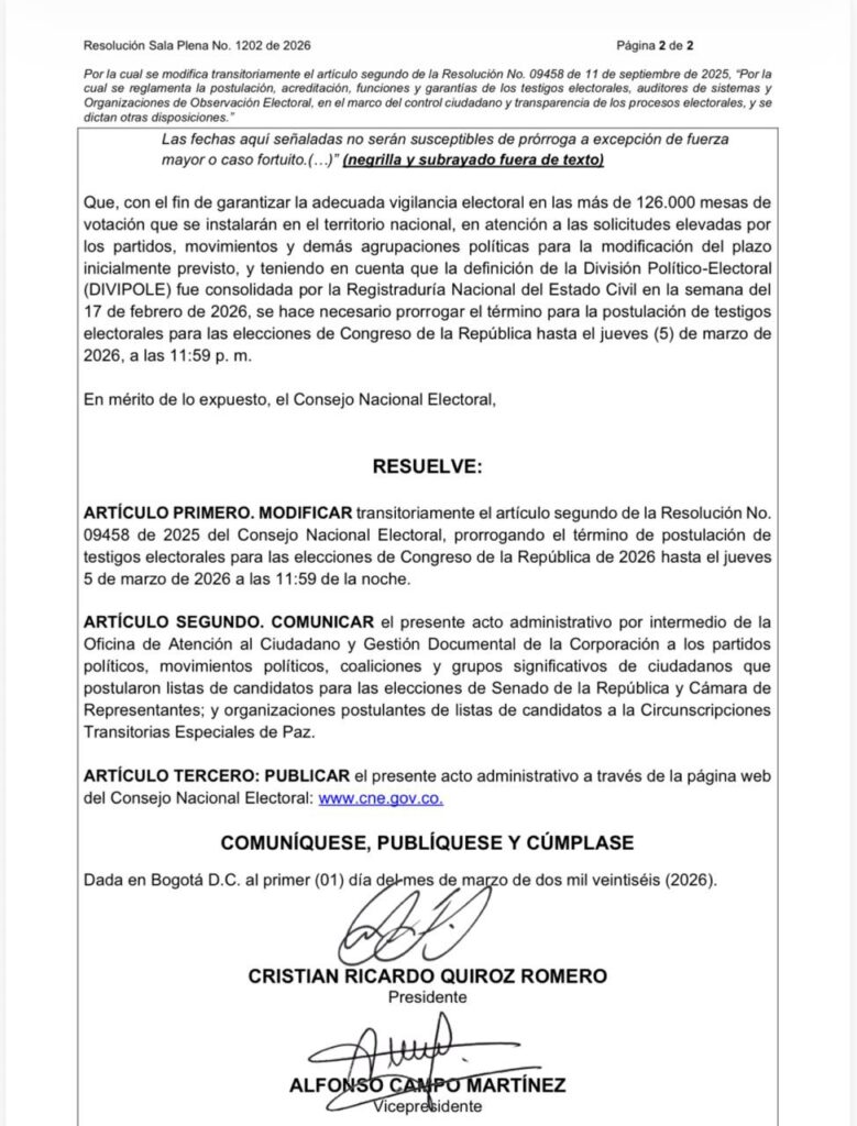 Mediante la Resolución 1202 de 2026, el Consejo Nacional Electoral (CNE), amplió hasta el jueves, 5 de marzo, el plazo para que todas las agrupaciones políticas del país postulen a sus testigos electorales de cara a las elecciones al Congreso de la República y las consultas interpartidistas que se realizarán el próximo domingo 8 de marzo.