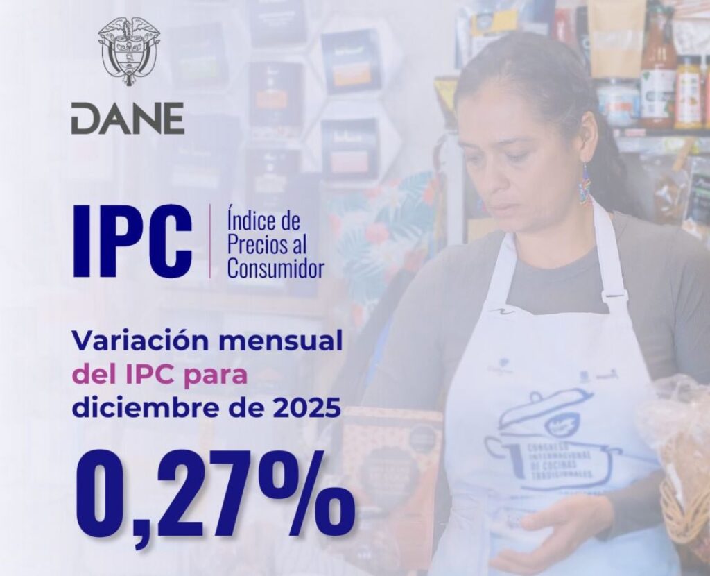 La directora del DANE, Piedad Urdinola, dijo que en diciembre de 2025 la variación anual del IPC fue de 5,10%, es decir. 0,10 puntos porcentuales menor que la reportada en el mismo período del año anterior, cuando fue de 5,20%. Este comportamiento se explicó principalmente por la variación anual de : Alojamiento, agua, electricidad, gas y otros combustibles. Alimentos y bebidas no alcohólicas