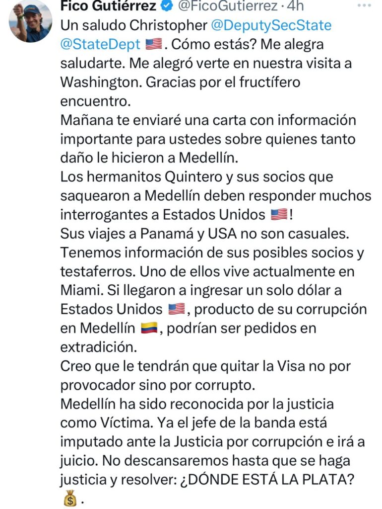 Siguió diciendo Federico Gutiérrez «Enviaré carta con información importante para ustedes sobre quienes tanto daño le hicieron a Medellin. Los hermanitos Quintero y sus socios que saquearon a Medellín deben responder muchos interrogantes a Estados Unidos. Sus viajes a Panamá y USA no son casuales. Tenemos información de sus posibles socios y testaferros»