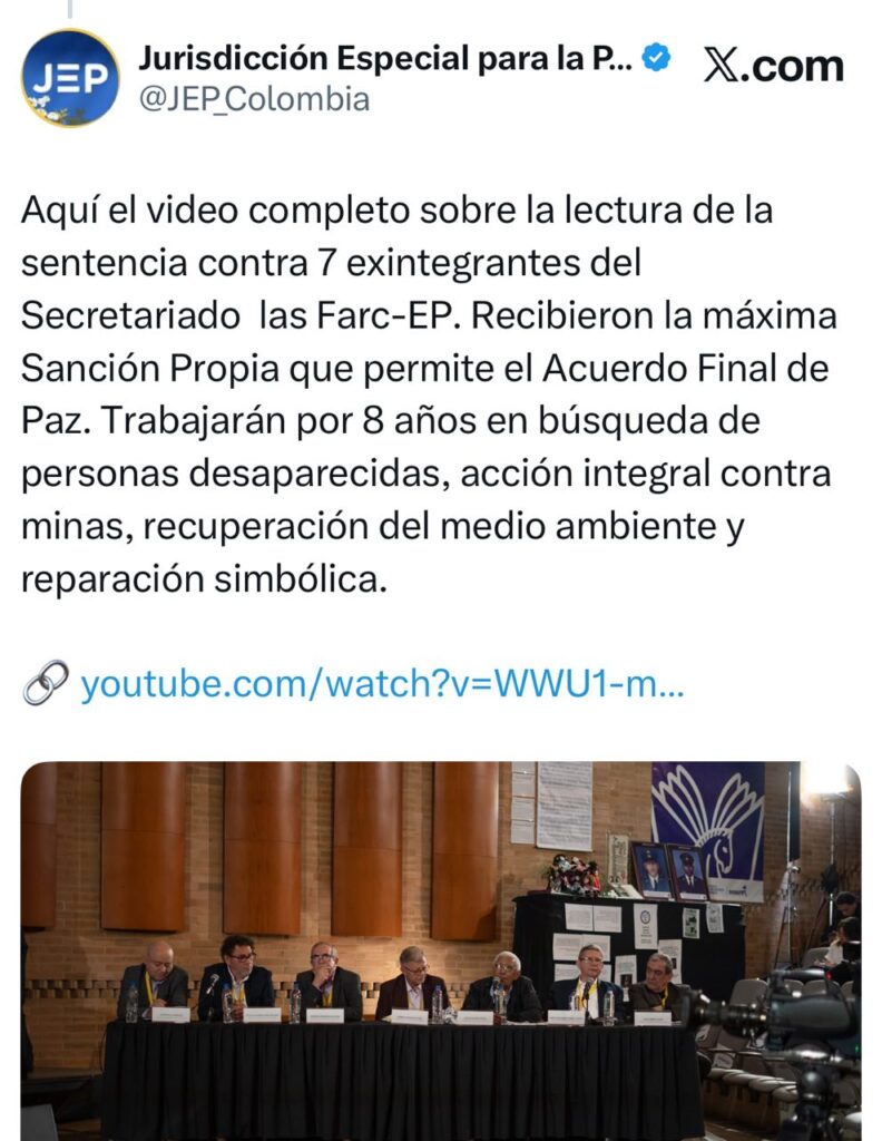 La JEP a través de la sección de reconocimiento de Verdad del Tribunal para la Paz emitió una sentencia considerada histórica donde condena a 7 exmiembros del secretariado de la FARC-EP con penas alternativas de 8 años por crímenes de secuestro.