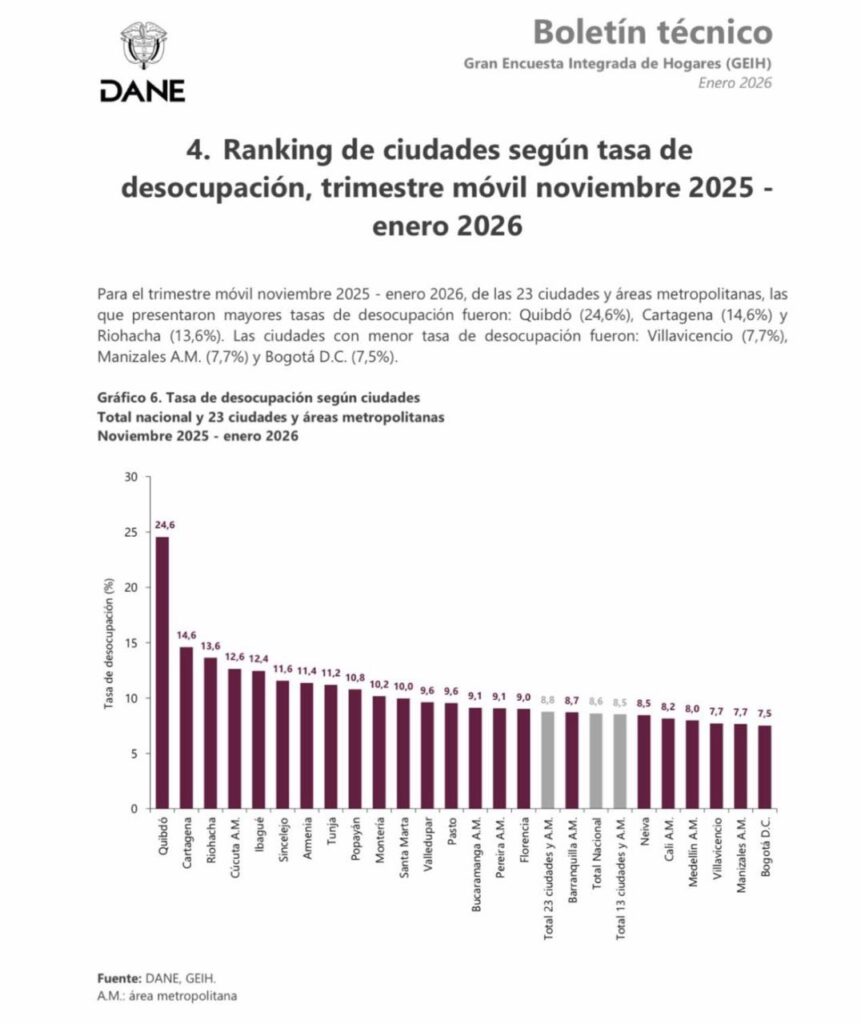 Según el más reciente informe del DANE, Barranquilla continúa disminuyendo el desempleo y baja de 10,3% a 8,7%, esta estadística demuestra que en esta capital hay oportunidades para todos, dijo el burgoamestre.