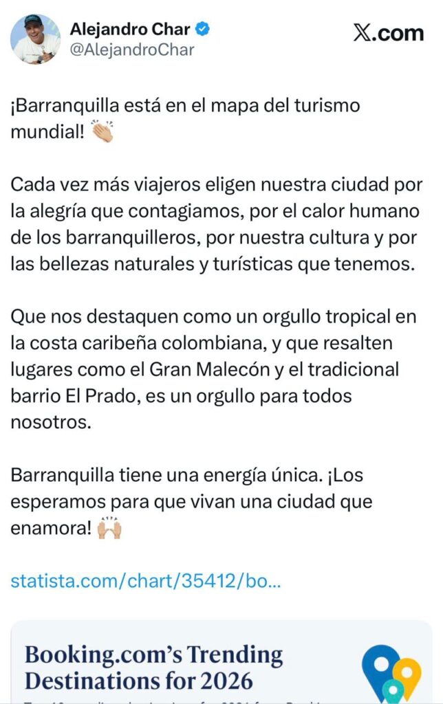 La Gerente de Ciudad, Ana María Aljure, manifestó que «según @bookingcom y @StatistaCharts,Barranquilla hace parte del Top 10 de destinos para 2026, junto a otros lugares como Bilbao,Guangzhou y Port Douglas. Barranquilla sigue ganando reconocimiento internacional, gracias a su transformación urbana y su oferta cultural»