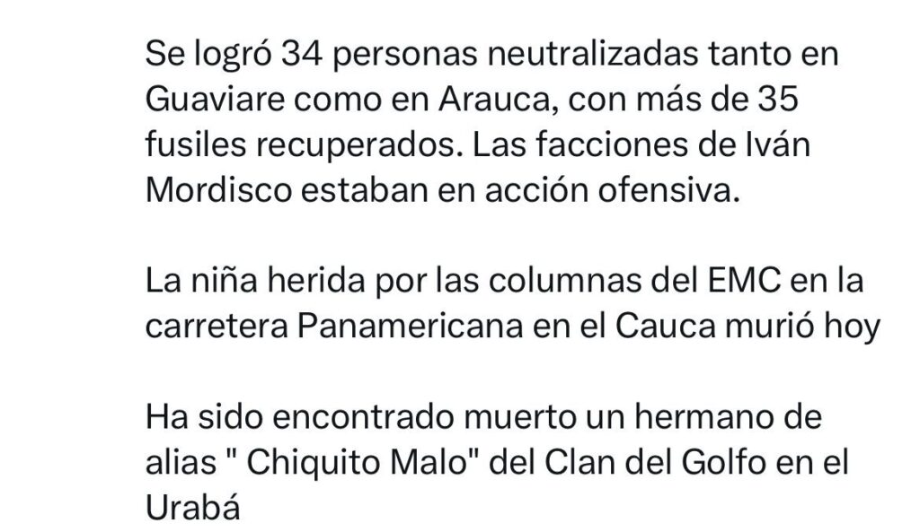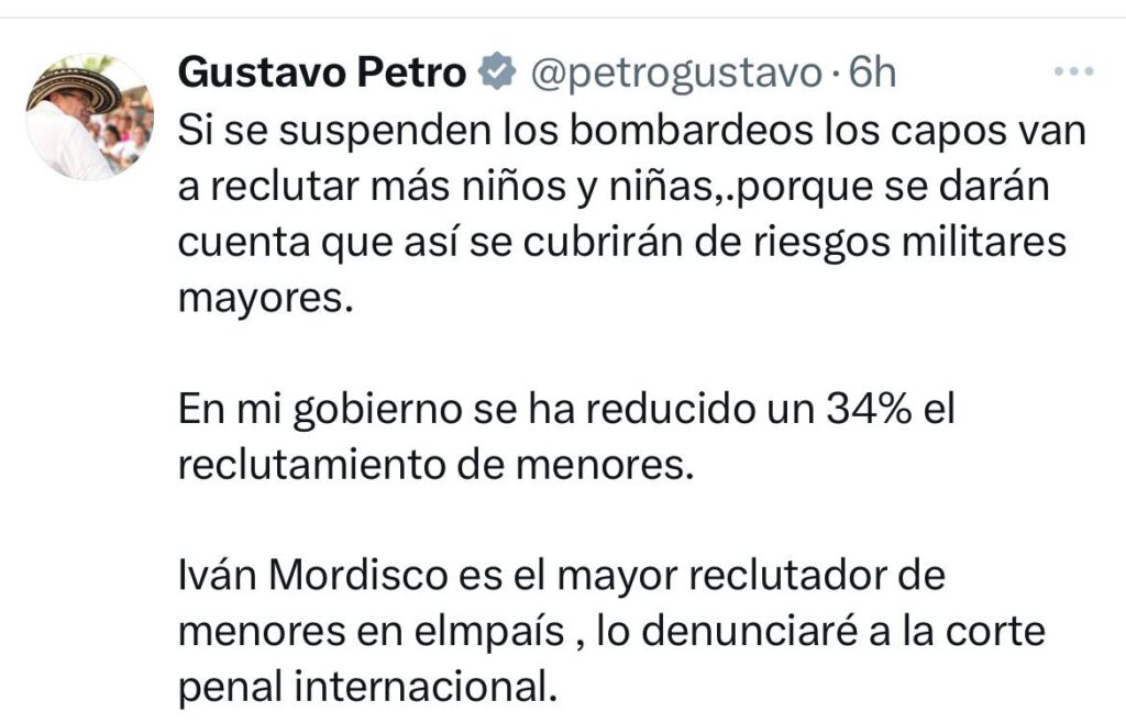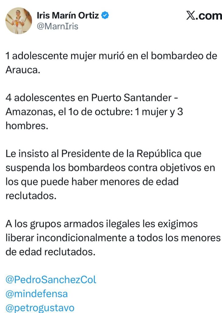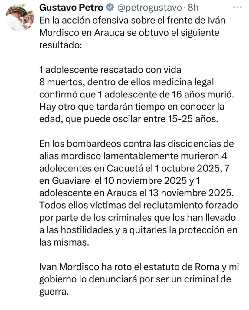 La semana pasada un menor murió por un bombardeo del Ejército contra los insurgentes en el departamento de Arauca, también otros cuatro adolescentes fallecieron en otra operación militar en octubre, confirmó en X el jefe de Estado.