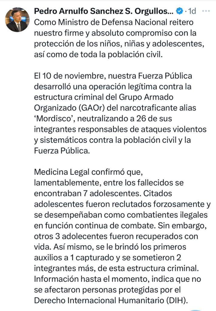 MinDefensa, Pedro Sanchez, reitera su compromiso con la protección de los niños, niñas y adolescentes ,escribió en X