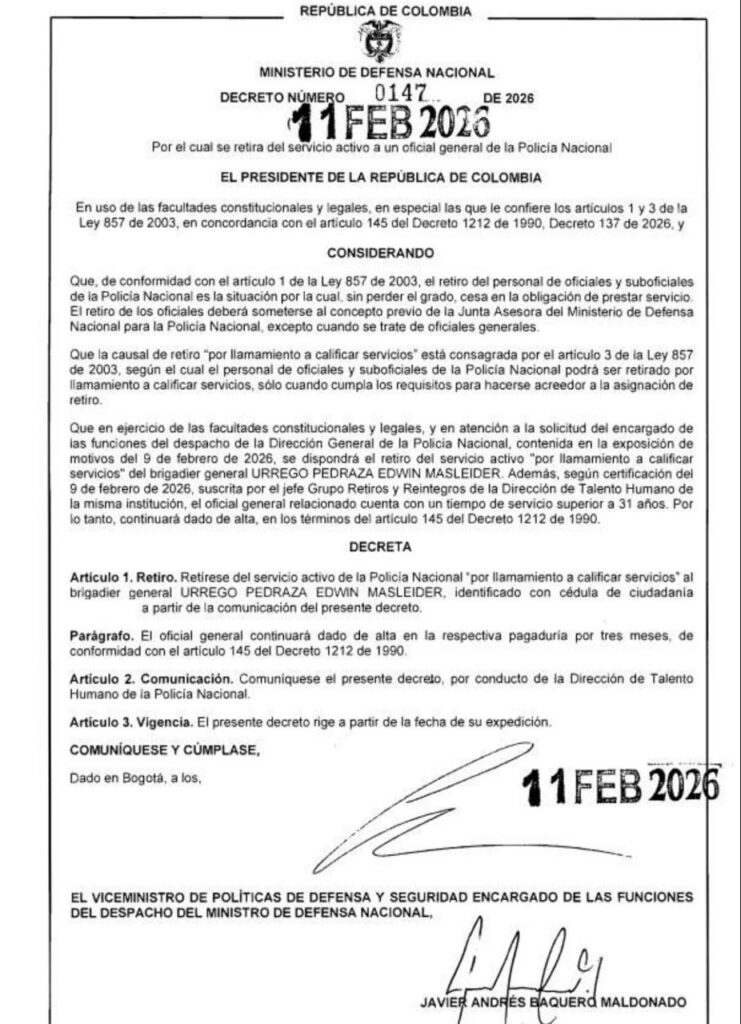 El presidente Gustavo Petro tomó la decisión de retirar al General Edwin Masleider Urrego, después que le fue entregado un informe de inteligencia donde señalan que el oficial fue el autor de un supuesto complot donde pretendía colocar narcóticos en uno de los vehículos del esquema presidencial para dañar la reunión que al final se llevó a cabo con su par norteamericano Donal Trump.