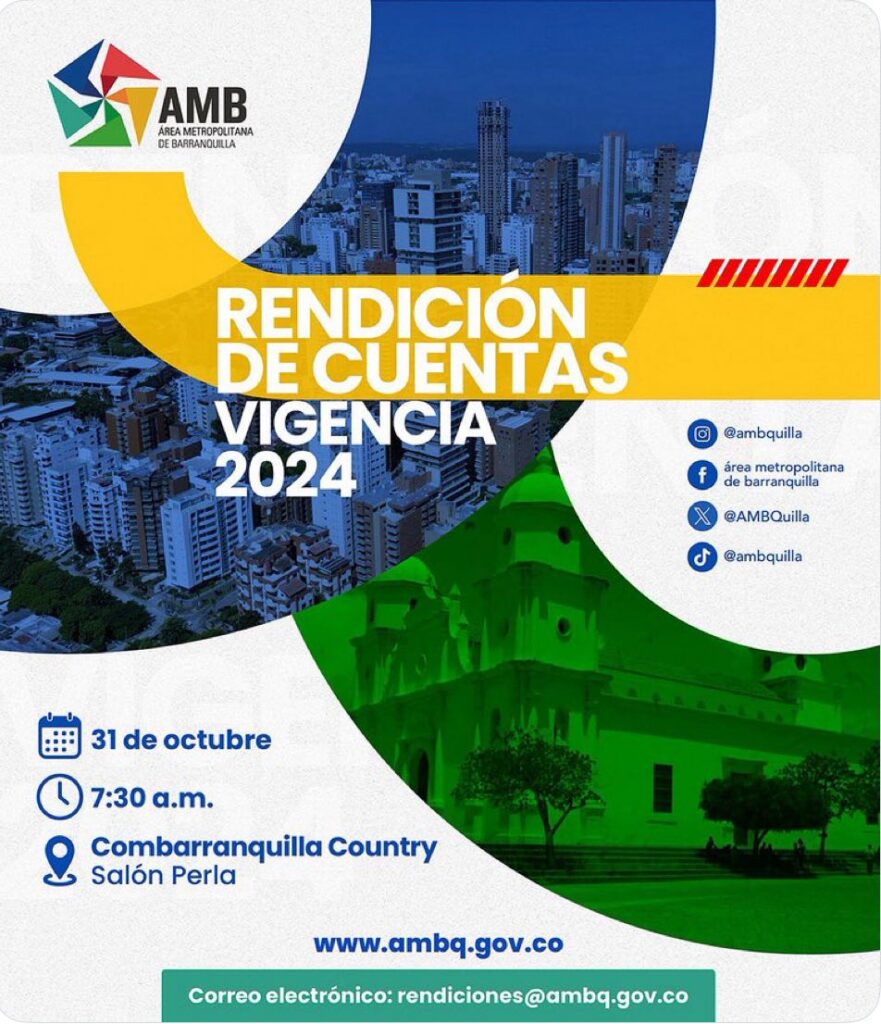 El Área Metropolitana de Barranquilla, está invitando a la ciudadanía a agendarse para el próximo 31 de octubre a las 7:30 de la mañana para conocer los avances , logros y retos que viene construyendo en beneficio de la ciudadanía en el marco de la Rendición de Cuentas 2024.