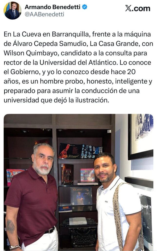 El Ministro del Interior Armando Benedetti y el Gobierno Nacional, respaldan las aspiraciones de Wilson Quimbayo para ser rector de la Universidad del Atlántico, dijo en Barranquilla el jefe de la cartera política.