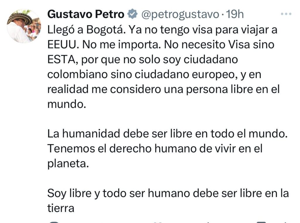 El secretario jurídico de la Presidencia de la República de Colombia, Augusto Ocampo, anunció su renuncia a la VISA de los Estados Unidos, en solidaridad con el Presidente de Colombia Gustavo Petro a quién el Gobierno de Donal Trump se la canceló.