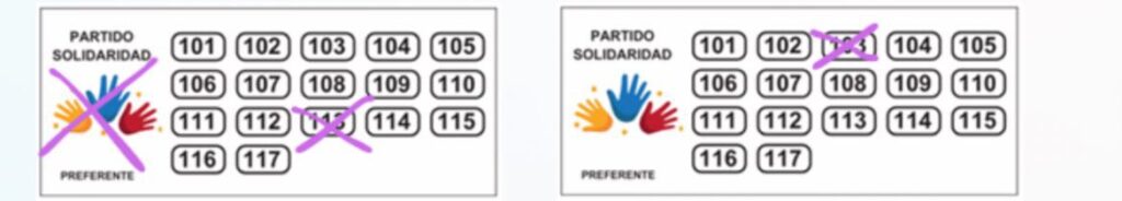 ¿Cómo marcar las tarjetas electorales? Si el ciudadano desea votar por una lista con voto preferente, tiene dos opciones: 1.- Marcar con una equis (X) o cualquier otro signo el logo de la agrupación política y el número del candidato de su preferencia o marcar directamente la casilla con el número del candidato de su preferencia