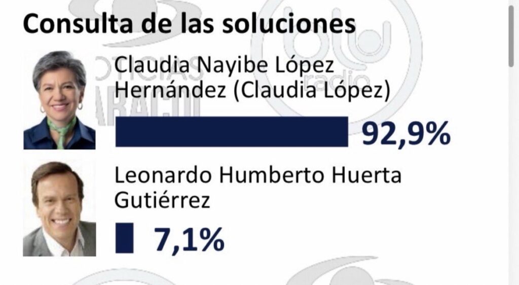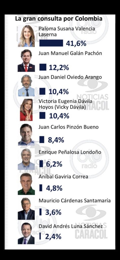 La Gran Encuesta publicada esta noche por Caracol TV llevado a cabo de manera personal por la firma Invamer S.A.S, financiada por Noticias Caracol y Blu Radio, realizaron 3.800 encuestas en 147 municipios de Colombia y llevada a cabo del 11 al 22 de febrero, da como lídera Iván Cepeda, con el 37,1%, la sorpresa es Claudia López exalcaldesa de Bogotá con 11,7% .