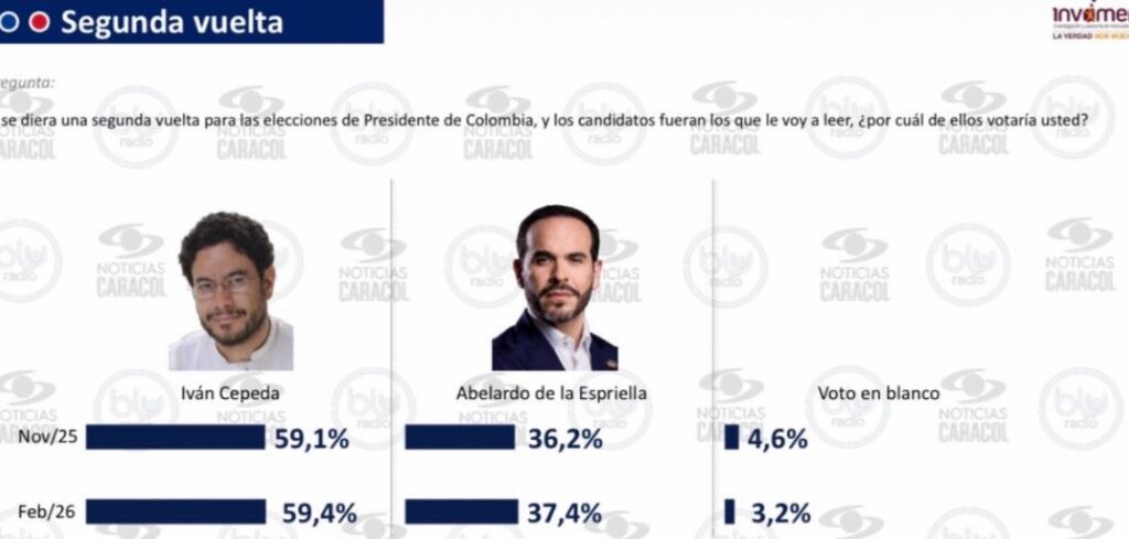 En esta encuesta Iván Cepeda duplica a Abelardo de la Espriella, Claudia López se trepa al tercer lugar, Paloma Valencia va ascendiendo poco a poco y se va acercando a De LaEspriella, Sergio Fajardo queda en quinto lugar, pero es claro que el Centro está vivo y coleando con Sergio Fajardo. También se mostraron resultados de la Consulta Interpartidista el próximo 8 de marzo.