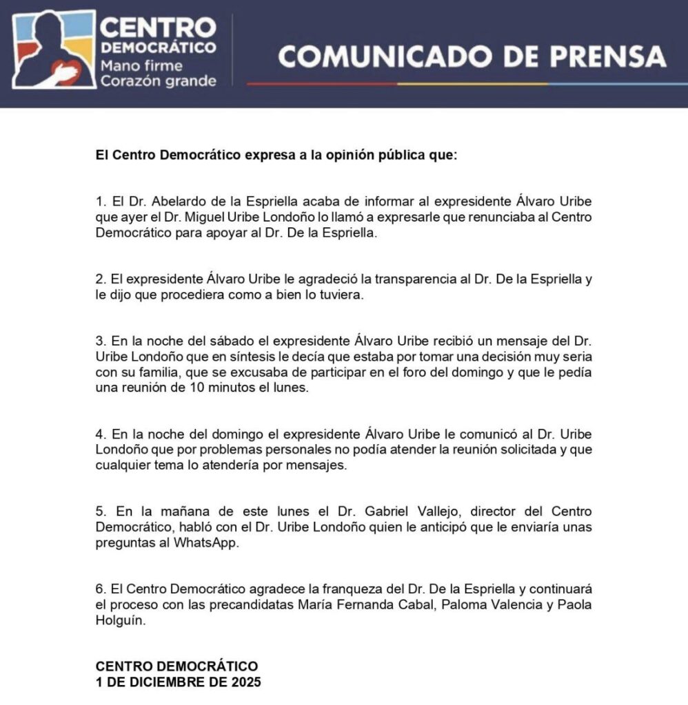 «Abelardo de la Espriella acaba de informar al expresidente Álvaro Urbe Vélez que ayer el Dr Miguel Uribe Londoño lo llamó a expresarle que renunciaba al Centro Democrático para apoyarlo»