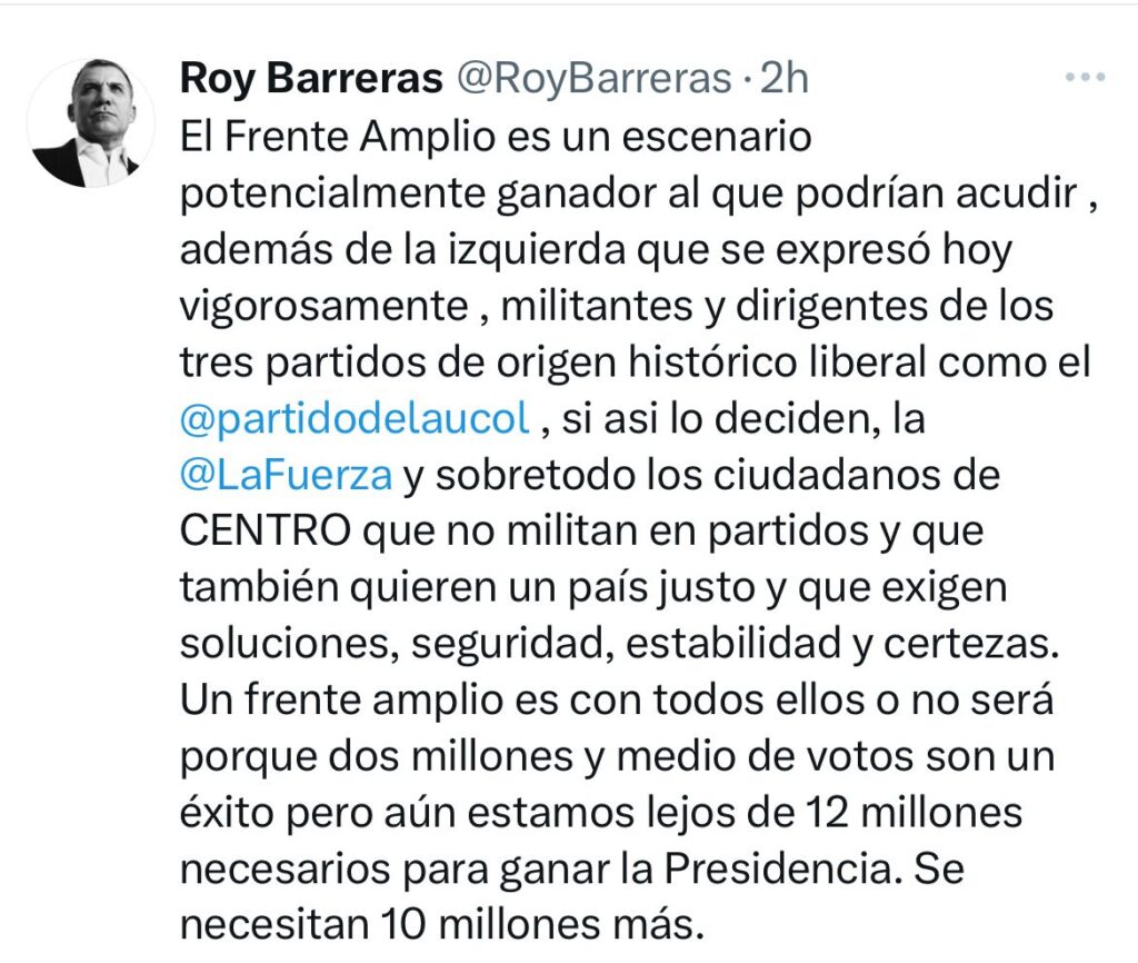 Frente Amplio y Fuerza, para avanzar en Colombia uniendo, la Izquierda, el Centro, los Liberales, para sacar adelante a Colombia, dijo Roy Barreras.