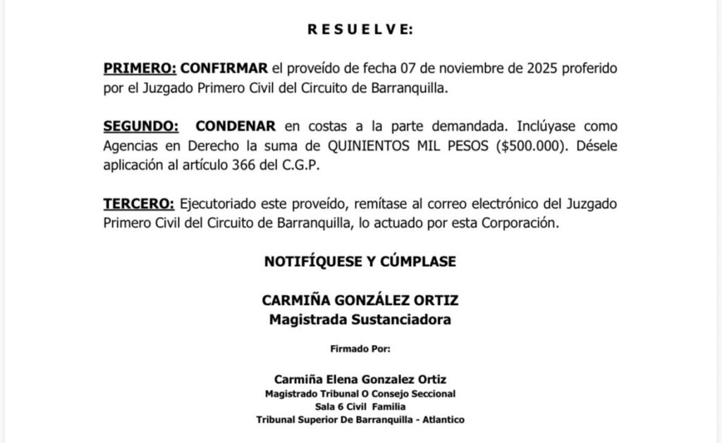 El fallo del tribunal, adoptada el 6 de marzo de 2026, resolvió el recurso de apelación presentado contra el auto del juzgado de primera instancia y que contrariando el Código General de Proceso servía de falso pretexto para el incumplimiento de la orden judicial.